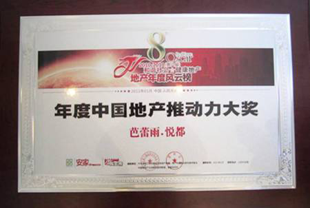 2011年1月9日,由全國工商聯(lián)房地產(chǎn)商會與《安家》雜志社聯(lián)合主辦的地產(chǎn)界盛典——第八屆“地產(chǎn)年度風云榜”評選在北京人民大會堂舉行隆重的頒獎儀式。奧特萊斯投資管理有限公司獲得“區(qū)域經(jīng)濟推動力功勛企業(yè)”大獎,芭蕾雨•悅都項目憑借產(chǎn)品創(chuàng)新優(yōu)勢以及開盤當日售罄的突出業(yè)績,榮獲“年度中國地產(chǎn)推動力大獎”。
