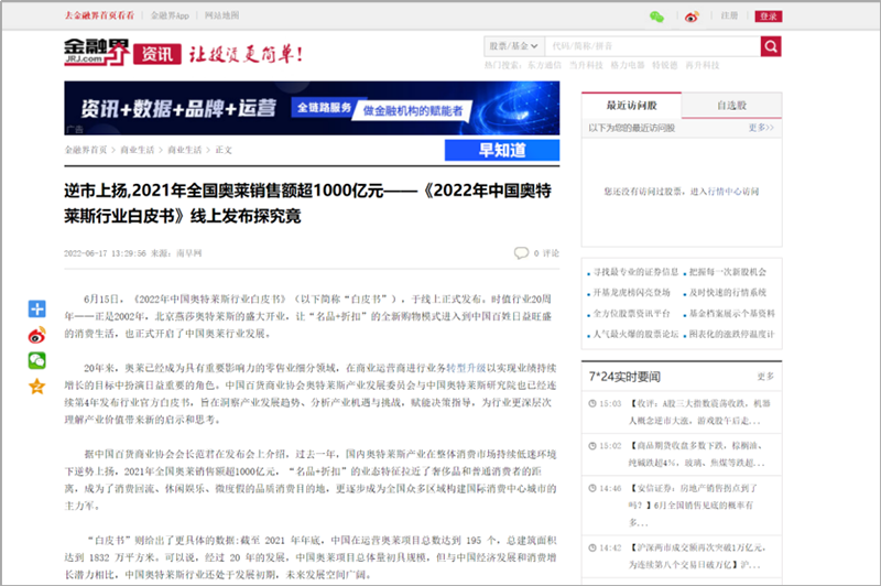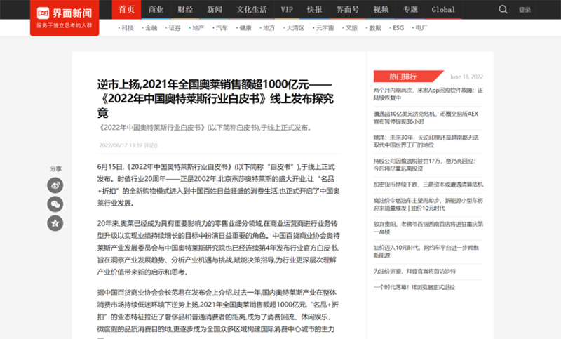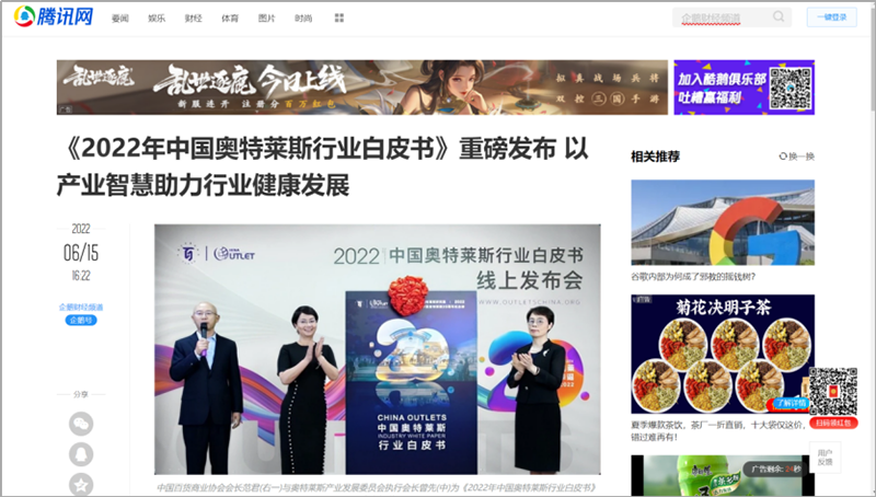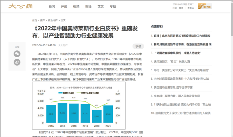 2022年6月15日,中國(guó)百貨商業(yè)協(xié)會(huì)奧特萊斯產(chǎn)業(yè)發(fā)展委員會(huì)線上直播發(fā)布《2022年中國(guó)奧特萊斯行業(yè)白皮書》。白皮書中“2021年中國(guó)零售市場(chǎng)最新發(fā)展、中國(guó)奧萊20年全覽、2021年中國(guó)奧萊市場(chǎng)發(fā)展、中國(guó)奧萊展望和政策建議、專家訪談”等內(nèi)容吸引政府領(lǐng)導(dǎo)、專業(yè)機(jī)構(gòu)、產(chǎn)業(yè)運(yùn)營(yíng)商、品牌商、服務(wù)商、媒體記者及眾多奧萊消費(fèi)者共計(jì)20余萬人參會(huì),成為國(guó)內(nèi)奧萊行業(yè)年度一大焦點(diǎn)。