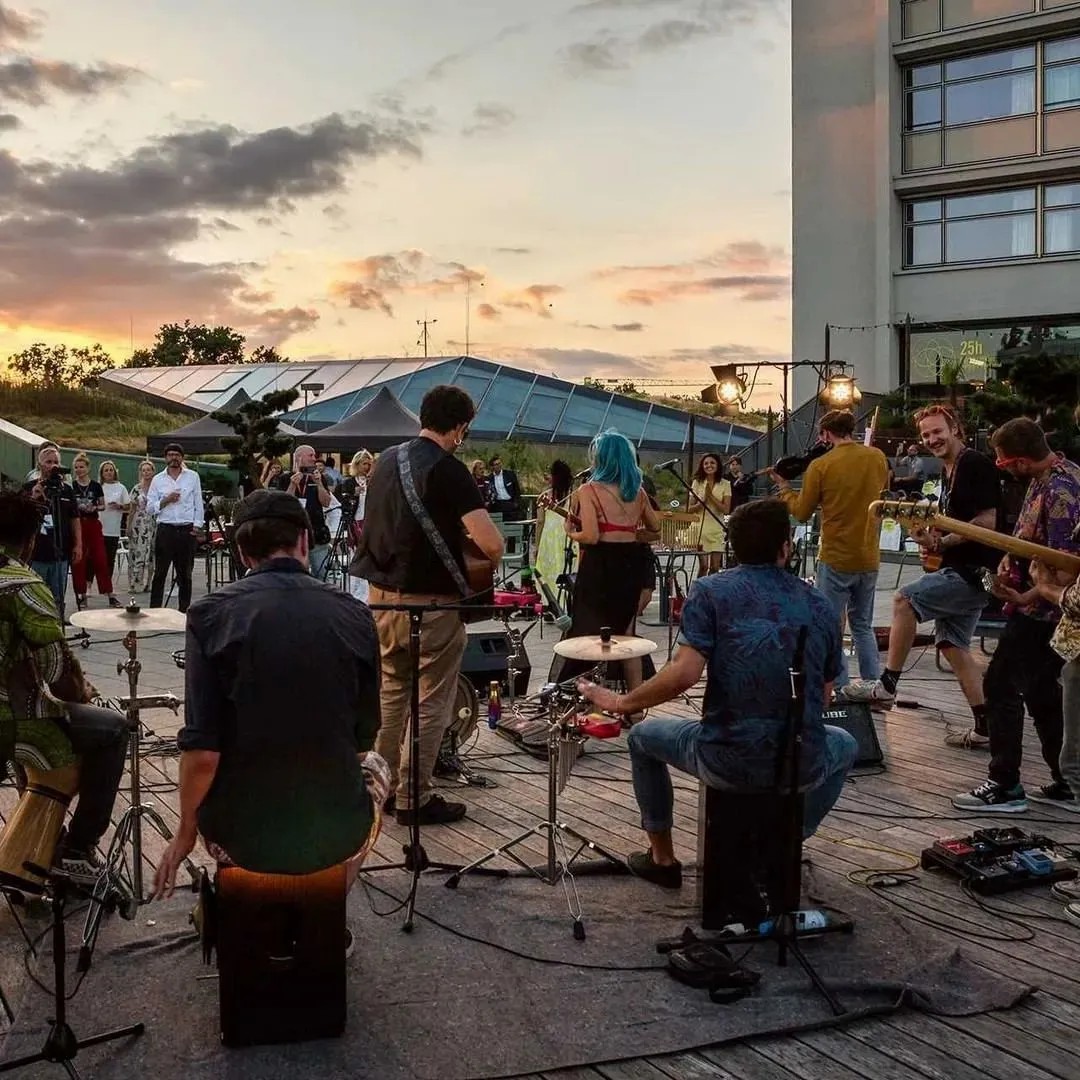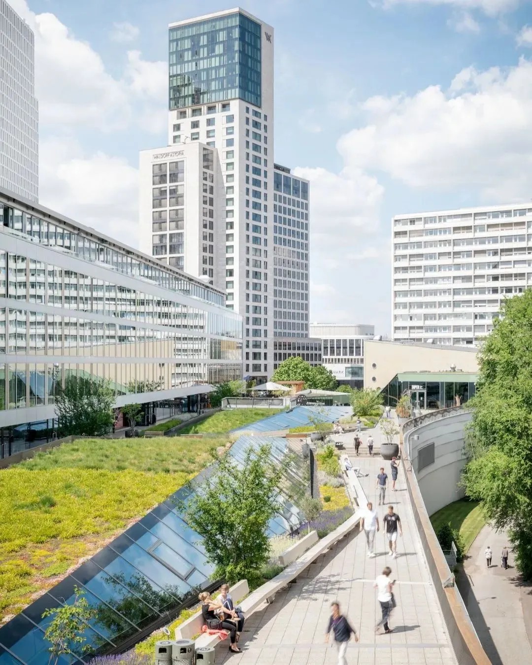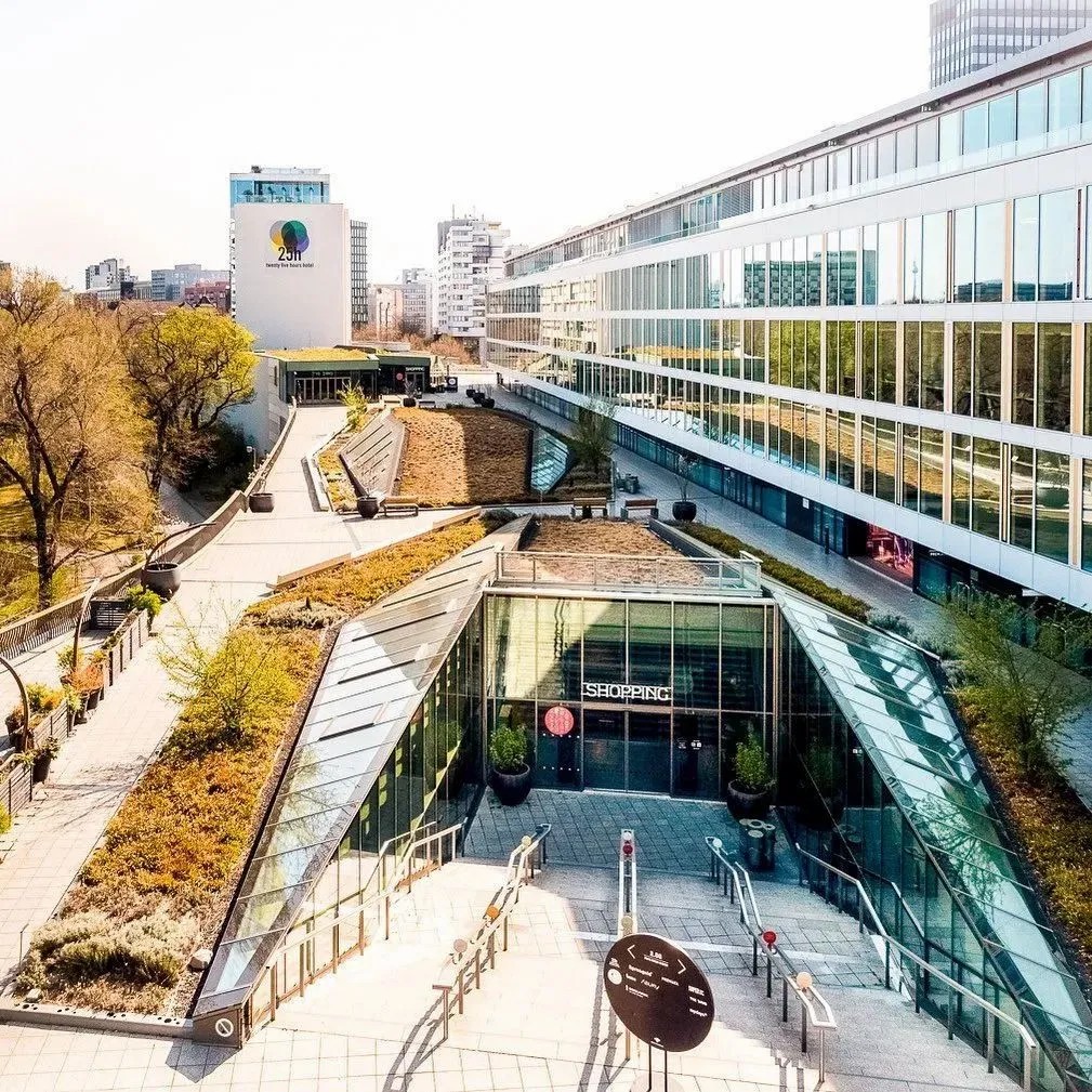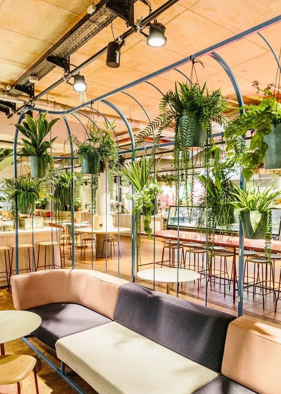 在商業(yè)的二層則設(shè)置了一個(gè)開放、通透的公共空間,同柏林潮流酒店25小時(shí)(Twenty five hours hotel)進(jìn)行聯(lián)通。并以城市綠洲為設(shè)計(jì)概念,在頂層設(shè)計(jì)了一個(gè)布滿植物盆栽的七千平方公尺的天臺,供給顧客休憩社交,營造自由、無拘束的商業(yè)氛圍,與項(xiàng)目的整體定位相得益彰。