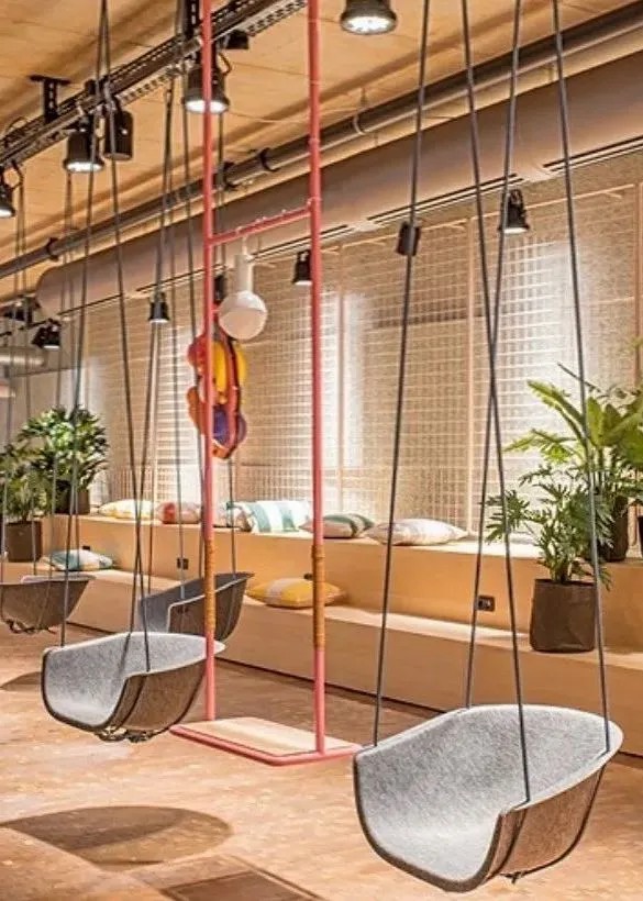 空間以明亮的粉彩和摩登風(fēng)格將顧客帶入加利福尼亞的風(fēng)情世界,還通過一系列不同尋常的材料組合,為顧客提供不一樣觸覺、視覺體驗(yàn)的潮酷餐飲空間。顧客可以選擇坐在落地窗前邊品嘗美食,邊欣賞對面動物園的猴山;也可以選擇以鳥籠為靈感設(shè)計(jì)的沙發(fā)區(qū),或是以階梯座的秋千林立的休閑區(qū)等。