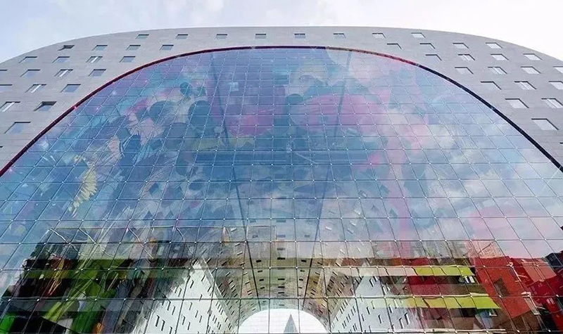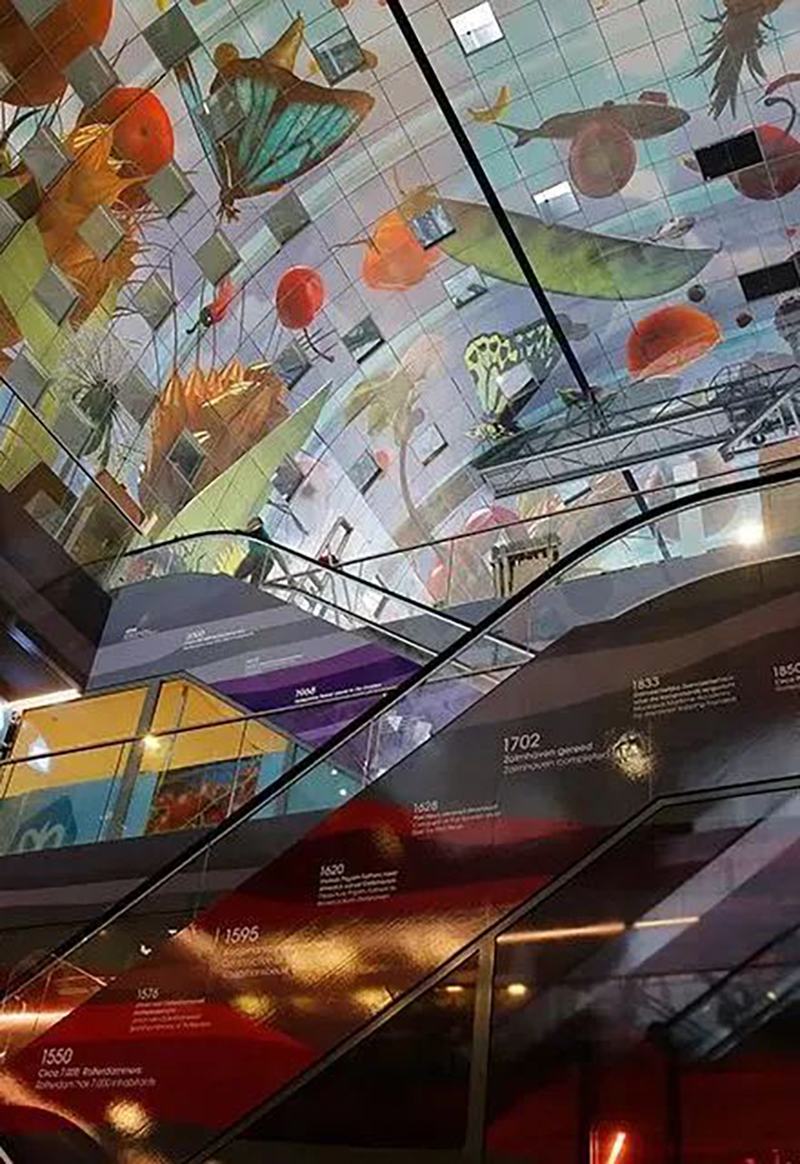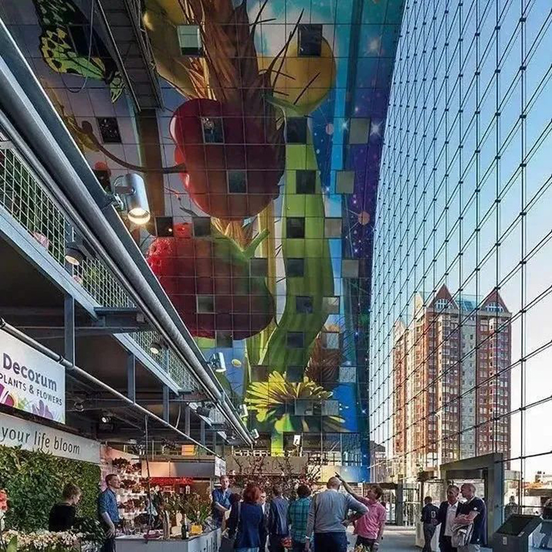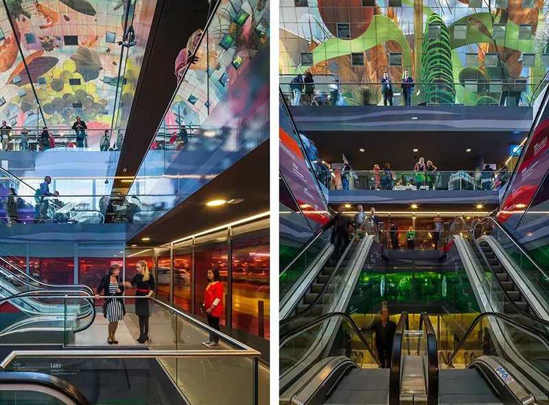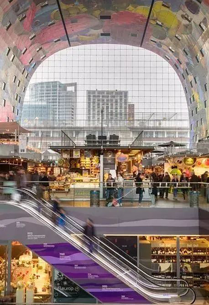 建筑弧形的內(nèi)面11000㎡的彩色藝術(shù)品“豐饒之角”,是由Arno Coenen和Iris Roskam創(chuàng)作而成,將水果、魚、面包、鮮花與附近的大教堂等元素重疊交織而成。項(xiàng)目除兼?zhèn)鋫鹘y(tǒng)菜市場(chǎng)銷售食材的功能外,消費(fèi)者還能在“美食市集”享受餐飲的服務(wù)和游逛的體驗(yàn),大大滿足人們的訴求。