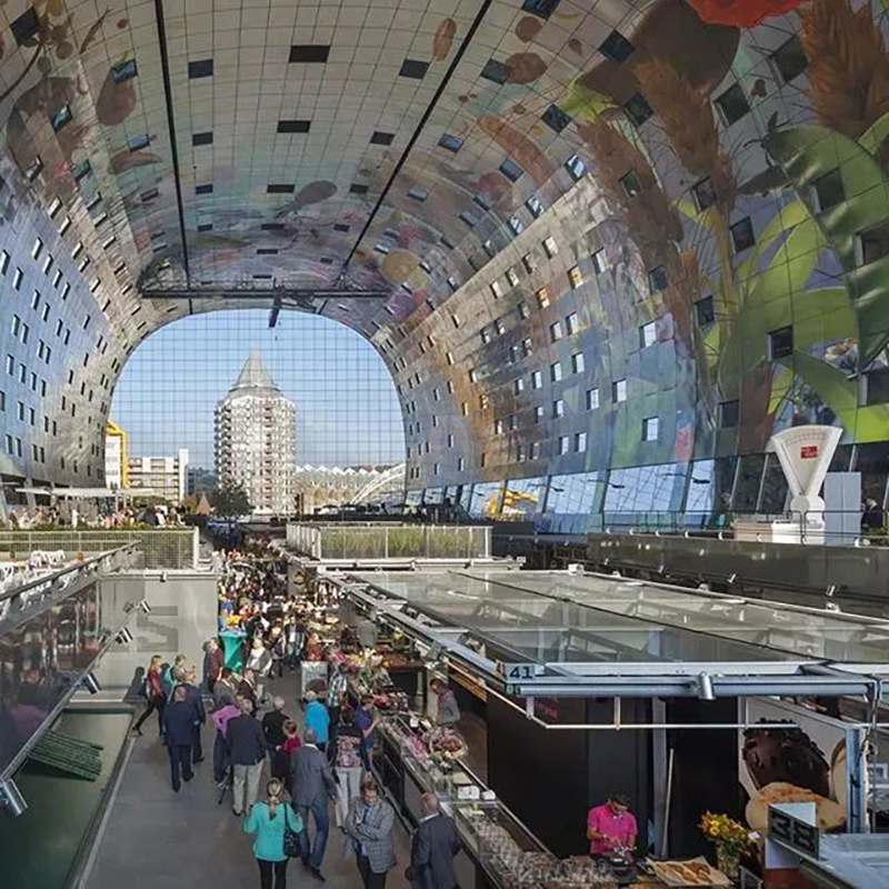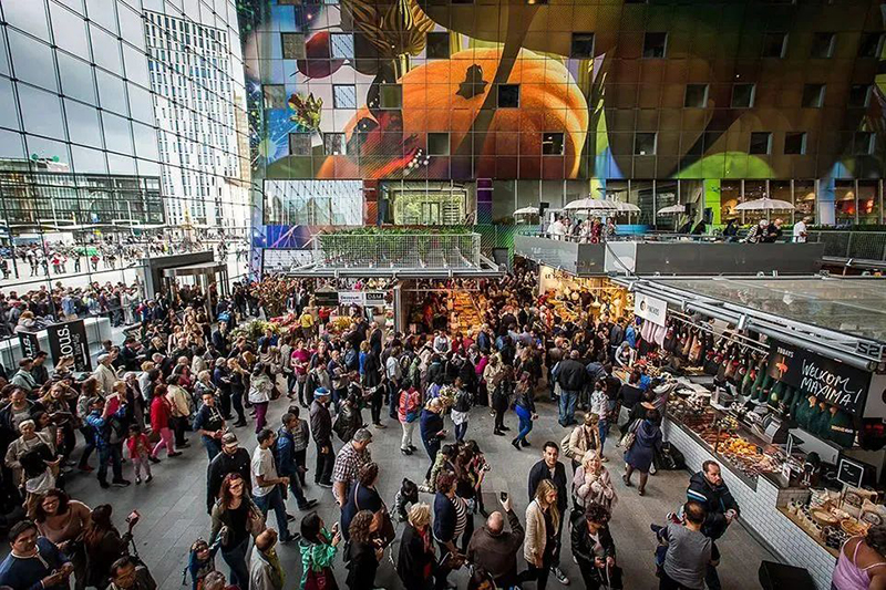 開(kāi)創(chuàng)「美食市集」先河的荷蘭Markthal市場(chǎng),自2014年開(kāi)業(yè)以來(lái),就受到全球各界人士的關(guān)注,年均吸引參觀游客達(dá)4.5-7百萬(wàn)人次。作為荷蘭全國(guó)第一家室內(nèi)市集,以及結(jié)合居住和購(gòu)物的新城市建筑類型,成功從傳統(tǒng)的菜市場(chǎng)轉(zhuǎn)型為具備藝術(shù)性的文藝空間、生活集市、展覽空間、創(chuàng)意工作室、綠色休閑空間以及特色居住單元空間。