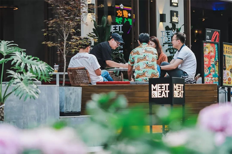 項(xiàng)目通過(guò)將調(diào)性契合的小眾品牌聚集,避免商業(yè)項(xiàng)目被一個(gè)個(gè)孤立且陌生的品牌瓜分,形成一個(gè)完整且相互聯(lián)動(dòng)的品牌集合,打造新型社交場(chǎng)景下的美食市集空間。MEET&EAT猶如一個(gè)專注于餐飲內(nèi)容的買手店,充分利用小眾優(yōu)質(zhì)品牌的同時(shí),有目的地孵化出所需的餐飲內(nèi)容,除了可以體驗(yàn)“早C晚A”外,還能讓川味小吃店與面館做鄰居,攜手推出套餐。