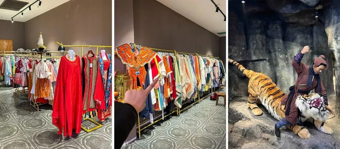 宋朝食間的另一大亮點(diǎn)是漢服體驗(yàn)館(需付費(fèi))。除了提供宋朝傳統(tǒng)的男子常服襕衫、女子襦裙款式,也有不少經(jīng)過改良的“新中式”款式。換上古裝后,可以到多個(gè)拍照點(diǎn)位打卡,如武松打虎、魯提轄倒拔垂柳等經(jīng)典場景,還可以到大舞臺,看各式文藝表演。
