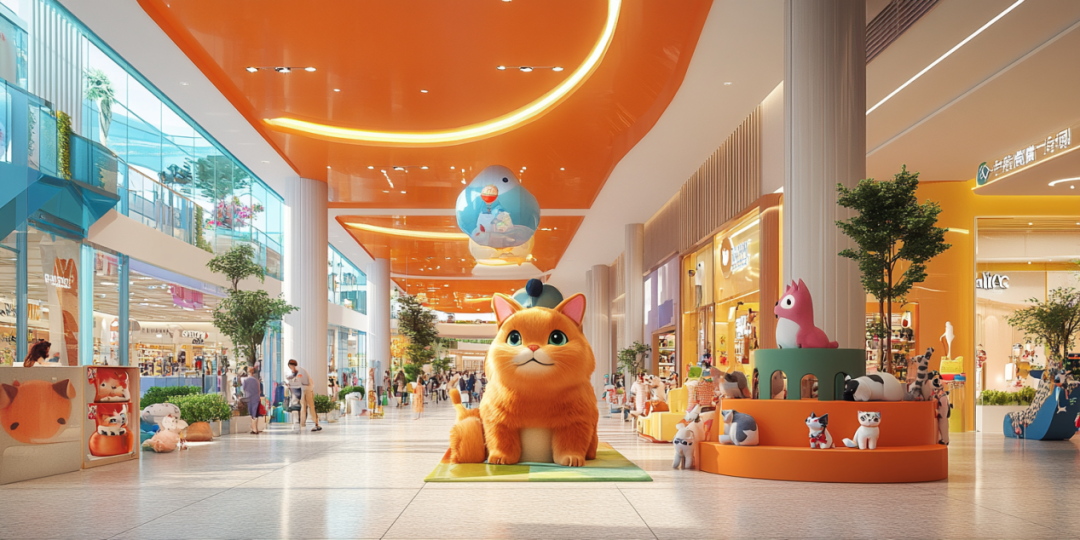 A場(chǎng)景:位于寵物友好購(gòu)物中心一層,連接室內(nèi)外區(qū)域有家寵物零售店,店門口提供寵物推車,貨品陳列展臺(tái)尤其是寵物玩具類展臺(tái)略高于寵物推車,與寵物視線基本持平。店鋪店員自帶友好氣質(zhì),對(duì)來訪寵物的主動(dòng)親親貼貼毫無抵抗力。店內(nèi)到處可見主人們各自推著小車帶著貓貓狗狗,三三兩兩聚在一起聊著自家寶貝的名字、習(xí)慣與性格。直接進(jìn)入商場(chǎng)或從店鋪進(jìn)入商場(chǎng)都無需回避安保人員的“眼神拷問”,符合城市飼養(yǎng)規(guī)范的寵物均可自由進(jìn)場(chǎng)。