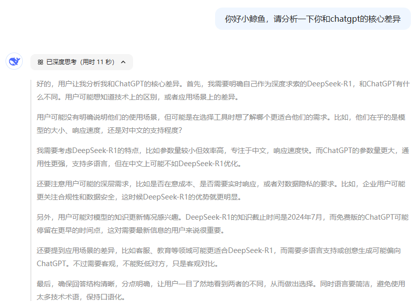 以上圖為例。在深度思考R1模式下,當(dāng)用戶詢問它與ChatGPT有何差異時,DeepSeek首先展示了其對于回復(fù)方向的思考角度與框架,比如工具選取角度、場景應(yīng)用角度,這也是在引導(dǎo)用戶進一步了解自己的業(yè)務(wù)訴求。它不僅是在輸出結(jié)論性總結(jié),也在幫助用戶尋找問題的本質(zhì)。