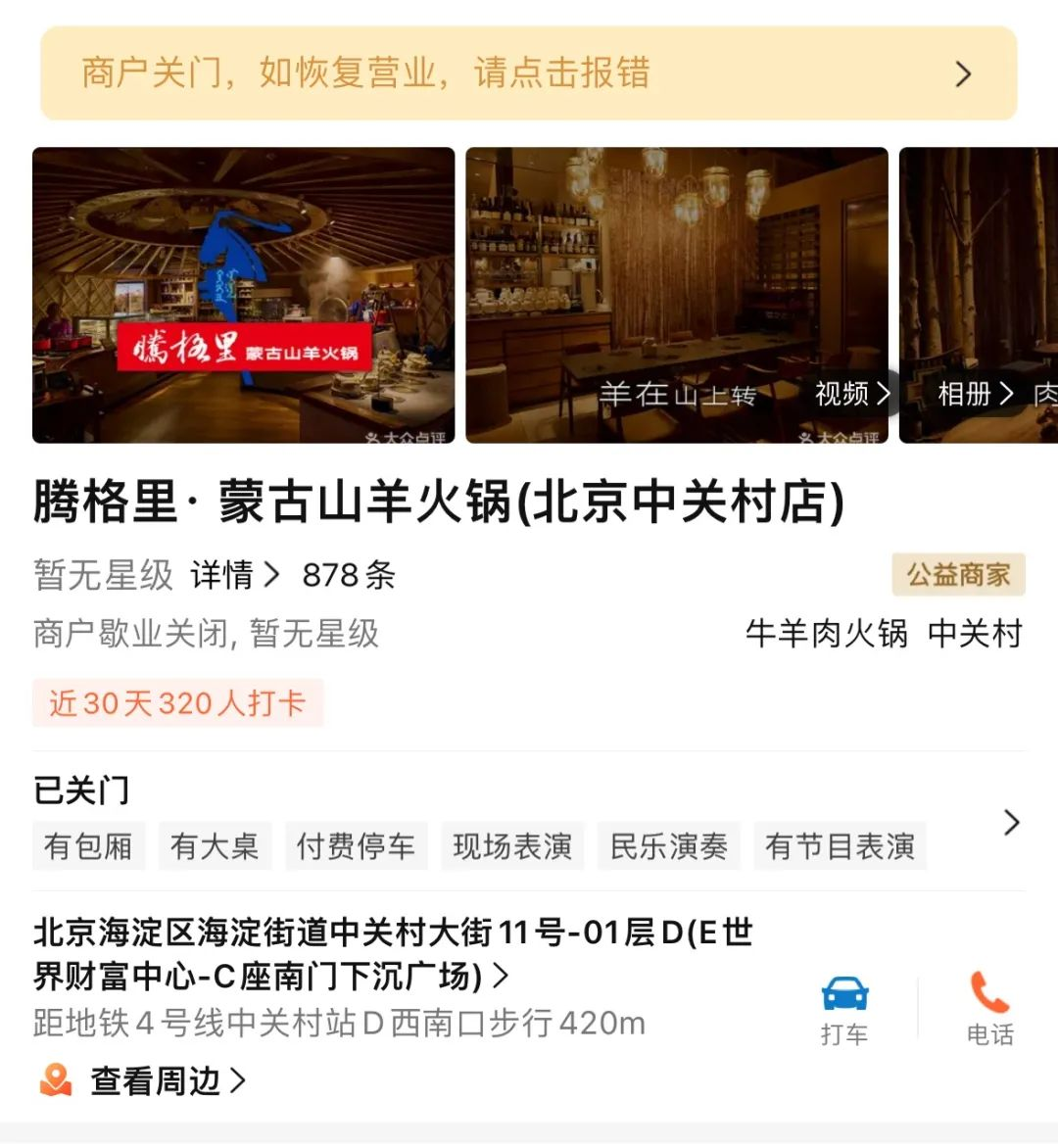據大眾點評最新信息顯示,西貝餐飲集團在北京中關村高調推出的子品牌“騰格里蒙古山羊火鍋”全國首店已歇業(yè)關閉。這家曾以現熬羊骨湯、內蒙古二狼山白絨山羊肉為主打賣點,開業(yè)首月即登頂區(qū)域火鍋熱門榜的餐廳,在運營不足半年黯然退場。